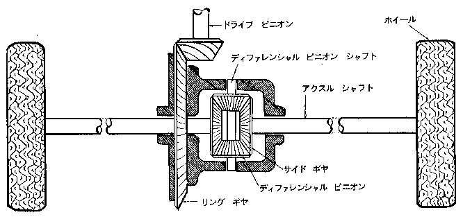ドライブピニオン⇒リングギア⇒デフケース(ボルトを介し)⇒ピニオンシャフト⇒デフピニオン(上下)⇒サイドギヤ(左右)⇒アクスルシャフト